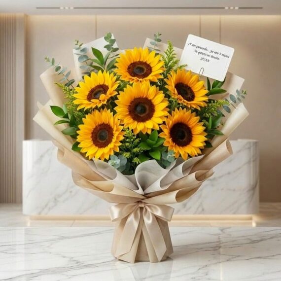 The elements that make up the Corsage or Bouquet of Sunflowers such as bases, decorations, boxes, wines, chocolates, balloons, stuffed animals, flowers, fruits and colors, may differ from the reference image, and these are subject to any changes that may be made. requires according to availability, however we do our best to please our customers even in the smallest details.